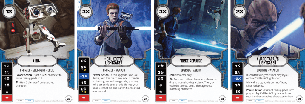 Cal Kestis’ Lightsaber – Simply amazing on Cal and pretty darn good on anyone else mainly due to the ability to roll a copy of itself into the pool if it is not showing damage while in your pool. Pay sides may make it a little awkward and keep it fair, but with an extra free dice potential it gives good value: 3/5