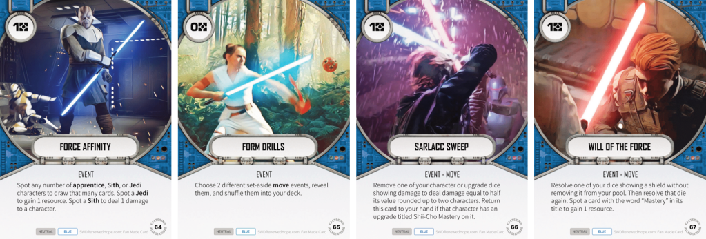 Sarlaac Sweep – We lose a few area of effect type characters with the rotation trigger but we get one back here in the shape of a move Event so we can drop this under Lightsaber Mastery or add it to our deck with Form Drills. It’s not a fabulous area of effect weapon as only hits two characters but will let you get in a little extra damage and you can remove a modified side for the effect which could prove very handy. It’s also one of the few cards that might make Saw’s Rocket Launcher playable: 3/5