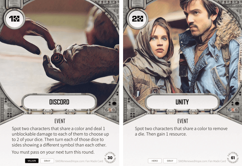 Discord is a 1 cost event that turns two of your dice, but with a huge additional cost. First off, you need to deal two of your characters that share a colour one damage each. The potentially bigger cost though is having to pass on your next turn. This means that the opponent has two turns to interact with your dice, or they could just take an action, then you pass, then they pass and the round is over. You’ve spent a resource and dealt yourself 2 damage for nothing. Plus you don’t even have free choice over the dice sides as they have to be mismatched. Not for me: 1/5