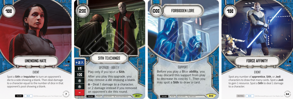 First, both are Sith, meaning things like Unending Hate, the draw effect of Forbidden Lore, and Sith Teachings do not get turned off when one-character (e.g. Vader) dies. Additionally, the power level of the deck does not plummet quite as much when one character is defeated. After all, for Taron/Vader, either character dying limits the power of Force Affinity and disables Taron’s power action – and that’s in addition to all the Sith cards and Ejects going inactive if Vader dies.