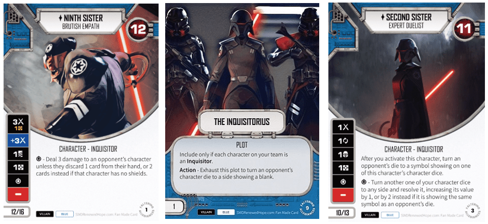 With the release of each Star Wars Destiny set there are always a few pre-made character line-ups that are worth exploring. Within Spark of Hope we had Reylo, a character pairing made possible with the plot Temporary Truce. Cassian Andor (WotF) finally found his perfect Mill/Kill partner with Jyn Erso when she was released a set later in Across the Galaxy. In Faltering Allegiances we also have a few thematic pairings. Today on echobase we will be taking a deep dive and analysis on The Inquisitors.
