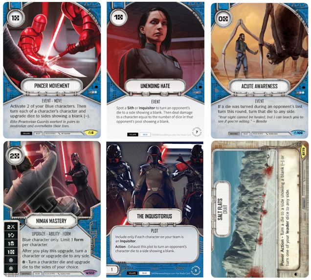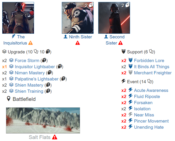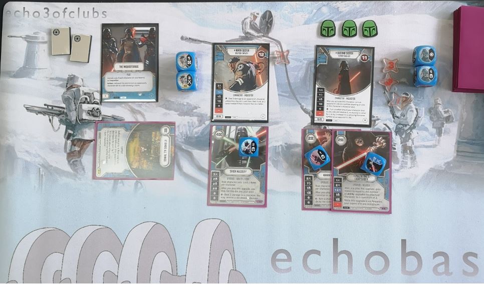 The Inquisitor Lightsaber is a really solid 2 drop upgrade that helps when you catch that modified side on Ninth Sister and a decent passive ability in which you can re-roll the die if it lands on a blank. Shien Training is a great upgrade; all resolvable sides are decent and it allows you to pitch an early Shien Mastery as you can bring it back later in the game. Niman Mastery is absolutely clutch on Second Sister as you really want to get her onto her special. Force Storm feels as brutal as ever. You are typically playing Palpatine’s Lightsaber for free.