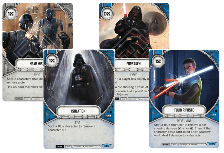 With this build we are packing 10 mitigation cards: Near Miss, Isolation, Fluid Riposte and Forsaken, plus I count Shien Mastery as a mitigation card. None of the events do anything special, each offer one for one value. Collectively, in between your mitigation and pseudo mitigation cards were looking at a deck with 18 mitigation options not including Second Sister, the Plot or the Battlefield!