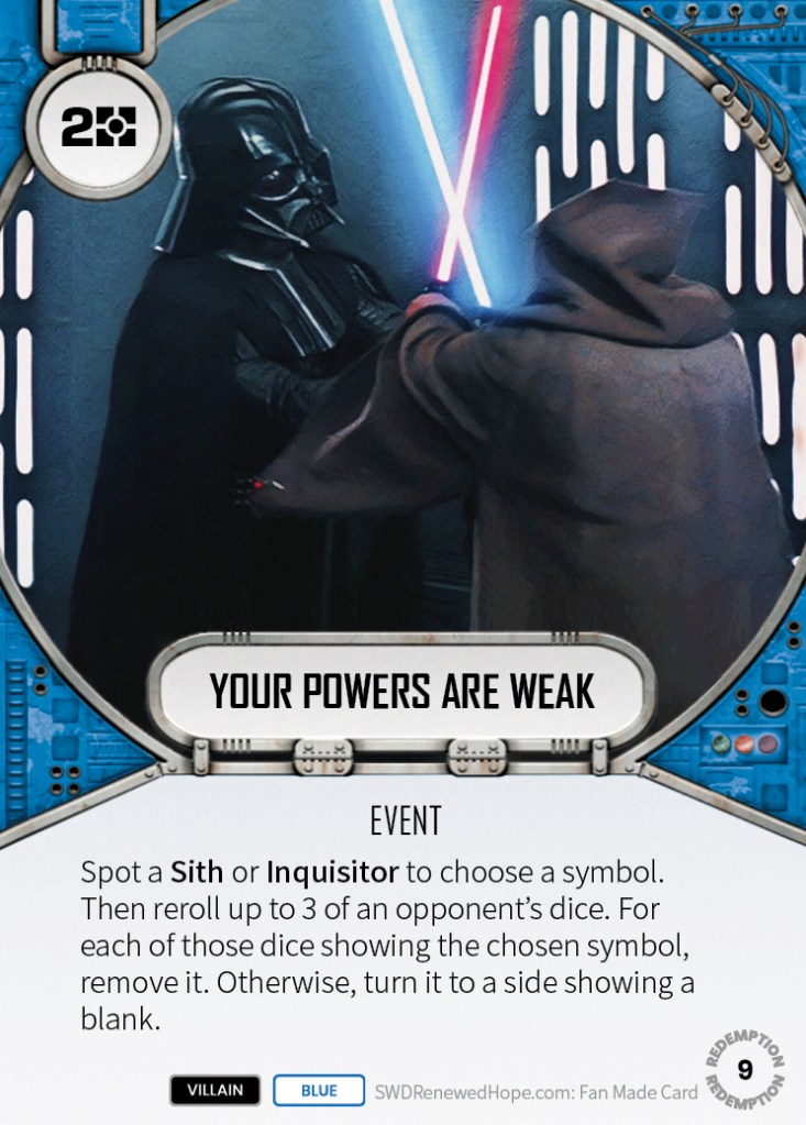 Finally, the event which was spoiled at the same time, Your Powers Are Weak This seems modelled after the yellow event Change of Fortune (but with better artwork), except while this version can only target 3 dice, you’re guaranteed to get value out of it as you get to blank any dice which aren’t removed (assuming they have a blank side), which synergises nicely with the Inquisitors.