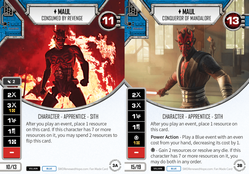 First up, I love the fact that A Renewed Hope are using parallel dice on the A side, and that they’ve signalled this with a beautiful logo. It’s not a great die, for sure, but it’s very solid for the cost. Flipping this character will probably require you to build around it, at least a bit, as you’ll want to be flipping at the end of round 2, or at least before activation round 3, meaning you’ll need A LOT of cheap events in your deck. Cards like Forsaken, On Guard and Acute Awareness are gold, as are any ramp events from other factions, but you might even consider cards like Dark Magick or Twin Strike to guarantee the early flip. A lineup with Lightsaber Mastery would also help here as you don’t have to play the event from your hand to trigger his ability. I’ve tried out a deck with lots of cheap events, and got the flip before round 3 activation 3 games in a row. Remember you have to pay the two resources immediately after playing the event as it’s part of the same after effect.