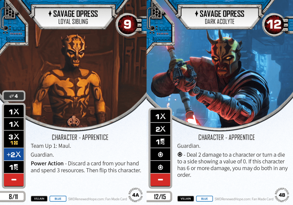 Savage Opress underwent a pretty serious Transformation at the hands of the nightsisters, so is another perfect candidate for a flip card. Re-using the Across the Galaxy Savage dice, the A side of this character is an absolute steal at 8/11, especially at 7/10 when paired with Maul. Ironically, he doesn’t actually pair very well with our new Maul B as you end up floating a point (unless you include United) though he would make the perfect partner for Spark of Hope Maul along with Rule of Two.