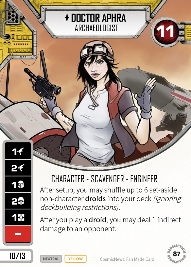 Above we’ve included all of the droids that are currently available in ARH Standard that Doctor Aphra will allow you to bring to the game. Where to start with Doctor Aphra? For one, she is absolutely a deck builder’s dream. A neutral character with an incredible die for 10/13. On the hero side Han Solo – Cool and Confident has taken this slot, but now we finally have a character that can rival that yellow 10/13 option for deck building.