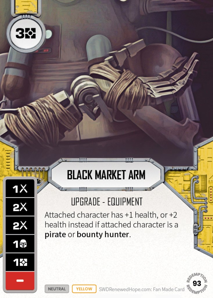 Black Market Arm shares the exact same die sides as Luke Skywalker’s Lightning Rod which with its release in WoTF cost 2 resources to play. For the additional resource we are getting a +1 health bonus; if played on a Pirate or Bounty Hunter, a +2 health bonus. For the 2 health this seems perfectly on par with balance, with the advantage being that the two benefits cost you just one card from hand. Interestingly we see another push on Melee focused yellow upgrades.