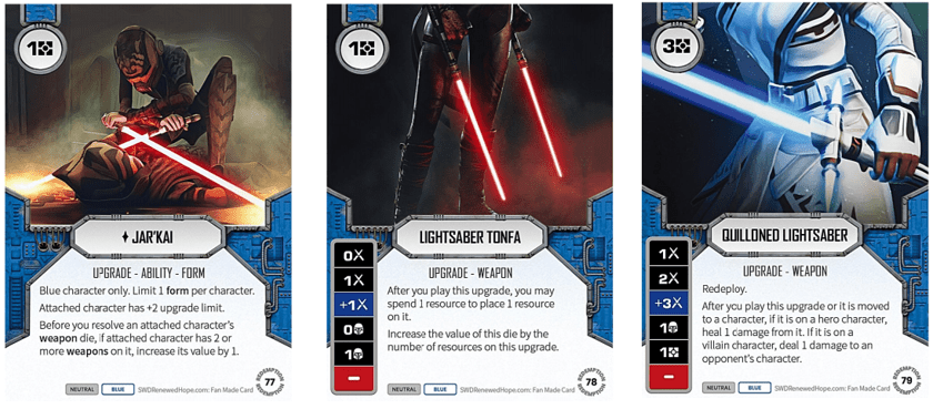 79. Quilloned Lightsaber – The same sides as an Heirloom Lightsaber with the exception that the 3 melee is a modifier. A welcome and playable 3 cost redeploy lightsaber with a twist on a on play ability. Which on play ability triggers will depend if you are playing a hero or a villain team, healing one damage or dealing one damage. But notably, for the first time, we see an upgrade that has an ability that triggers when moved between characters, incentivizing the opponent to target a different character. Excellent design. (4.5/5).