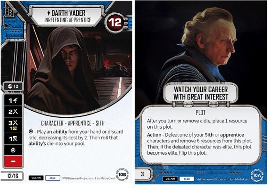 10A –Watch Your Career With Great Interest – As far as plots go this one’s really easy to flip to get a 12 health character. Combo Salt Flats and a Niman Mastery first round; you should have gained 4 resources on this plot if you were able to resolve the special on the Niman to good effect [echo7: you can even flip the Niman just before it gets removed to trigger the plot if there’s no other upgrades to flip]. Basically you should be getting this flipped at some stage during round 2. The problem is you have to defeat a character… we have several targets to defeat to bring in the new sulky Vader; Darth Zannah, Little Savage or you could even call Apprentice when you activate a Clawdite Shapeshifter. Alternatively you run this as a ‘just in case’ in a mono blue lineup, when one of your characters is near defeat you can pull the trigger and get Vader in, though bear in mind you do need two characters alive when you trigger this or you lose the game before Vader appears. Cool design, but I don’t see it being meta defining right now. (3/5)
