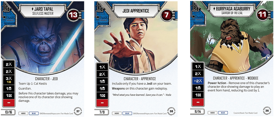 36. Burryyaga Agaburry – Saviour of Setzal – The most interesting part for me about this character is the fact that we have a blue Wookiee; he also does not have the typical Wookiee text of increasing his die showing damage by 1 if he has 6 or more damage. If he had the typically Wookiee text he’d be worth building around. As it stands I’m not looking to build anything with him any time soon. He has an interesting PA that could come in clutch if you’re out of resources and have a stranded modifier; but outside of this he just comes in as ‘OK’. (2/5)