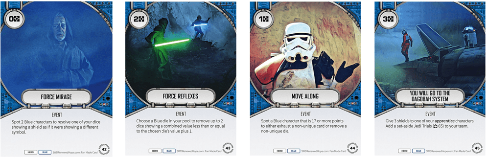 43. Force Reflexes – Multi-die removal isn’t missing from Hero blue as we have the mighty Jedi Mind Trick. An awkward spot requirement though because you have to have a die in the pool, which historically has proven tricky, plus if you’ve not rolled particularly strong you may not get to remove the opponents dice that are threatening (though it’s great against specials). I welcome multi-die removal, however Force Reflexes is not the strongest multi-die removal the set has to offer. (2/5)