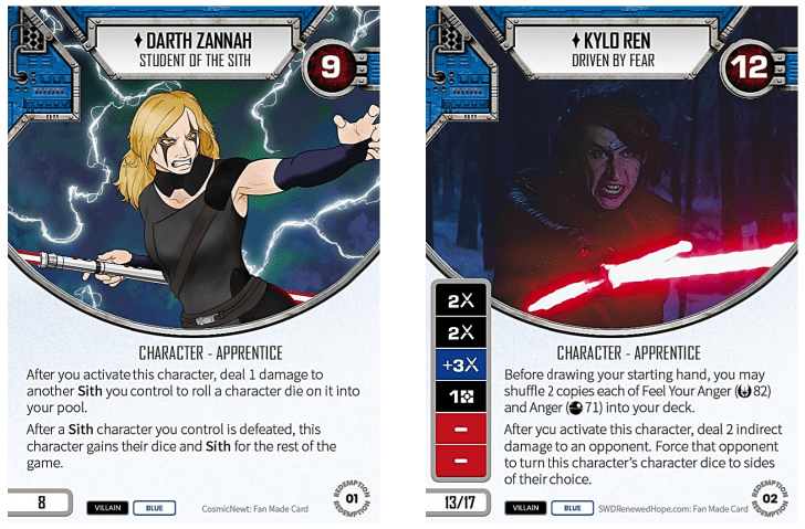 1. Darth Zannah – Student of the Sith – There’s been fair amount of fan call to get Zannah into the game [echo7: not least of all from me. Thanks ARH!] and she comes in as the perfect partner for her Sith Master Darth Bane. Lore wise: Darth Zannah was trained in the Rule of Two, so this seems like the perfect plot to run with these guys. Given that for the cost of a damage you can roll out a Bane die, this seems pretty strong. However, if she does not have an ability, after Bane dies that special becomes effectively a blank.