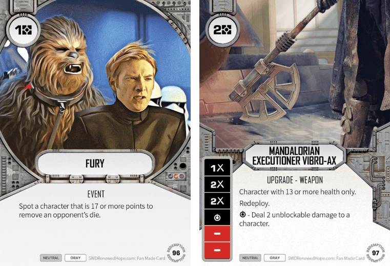 97. Mandalorian Executioner Vibro-Ax – this has to be one of the best 2-drops in the game right now, and a much needed one given how few decent ones there are in standard. Sure, it’s got 2 blanks, but it has 4 non-pay non-modifier damage sides for 2 resources, plus redeploy. Also, you can redeploy it onto any character, not just one with 13 or more health.