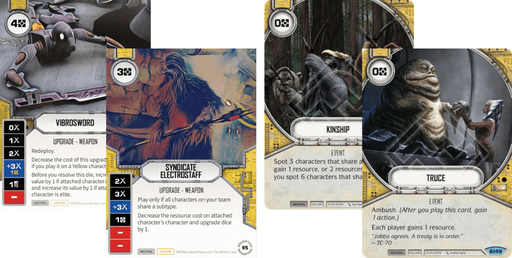 Other than ensuring I have at least one piece of removal on round 1, I am looking for Truce or Kinship to try to get to 3 resources to play one of my 3-drops on round 1. The best of these is the Syndicate Electrostaff; putting one of these on Lumpy takes his dice from a liability to a massive threat and I have no issue playing the Electrostaff on Lumpy after I have rolled him in. This will catch a lot of people off guard. With Tarfful always being the first target Lumpy is pretty safe to receive this upgrade. Vibrosword is a close second to play on round 1 with massive dice sides, redeploy, and 2 characters that trigger all the bonus effects.