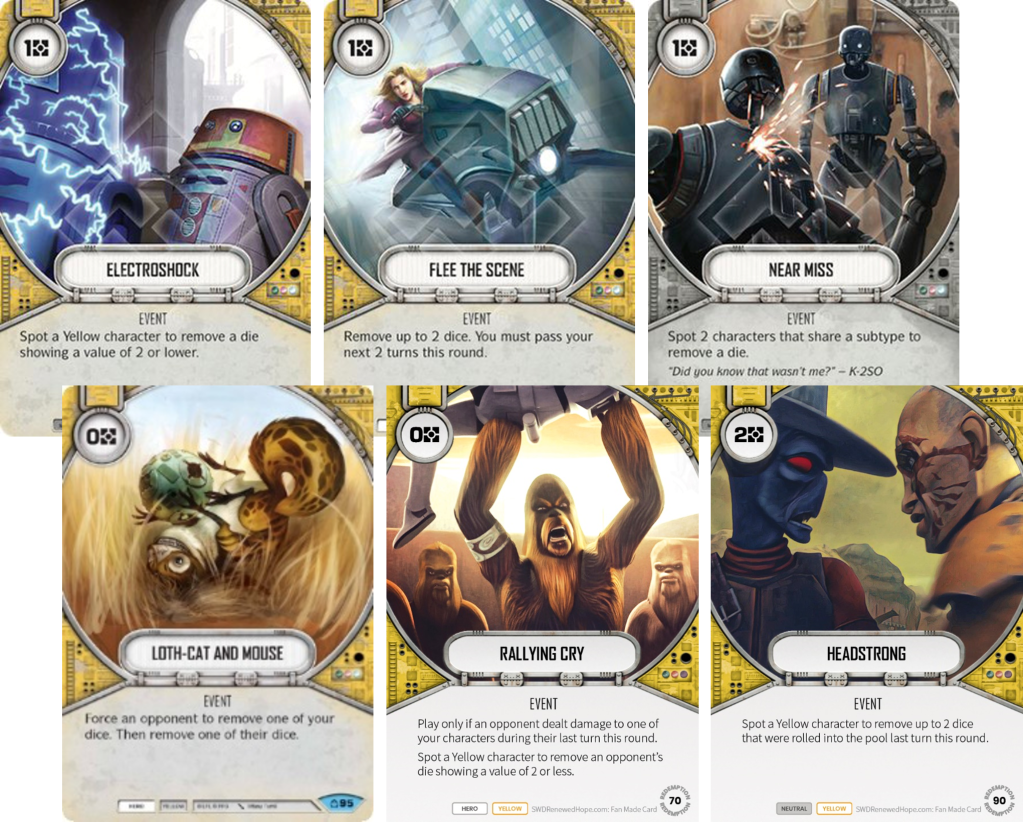 I then looked at a deck using Wullffwarro with 2 Vengeful Wookiees and bringing in Chewbacca [echo7: an idea also explored by ParkerSimpson and Chimaera, and published here]. This way I can start both Vengeful Wookiees at 6 damage each able to remove 1 dice each, every turn for free. Insane! Unfortunately while the Vengeful Wookies did exactly what they were supposed to do, starting them at 3 health left them just too easy to kill and once they started dying the deck lost all of its value. Starting with 3 dice myself also made it too easy for my opponent to control my dice and take over the game. I had big plans to use Our Situation Is Desperate to start the game with 2 characters at 3 or less health. But this is where I learned that with this build I was only including yellow characters on my team and thus could only include yellow cards in my deck. The red is being brought in after setup. I was unfazed and continued to experiment with different builds. What if I tried an elite Wullffwarro? With only 10 points left, what are my options? This is when I discovered Lumpawaroo and this lineup: