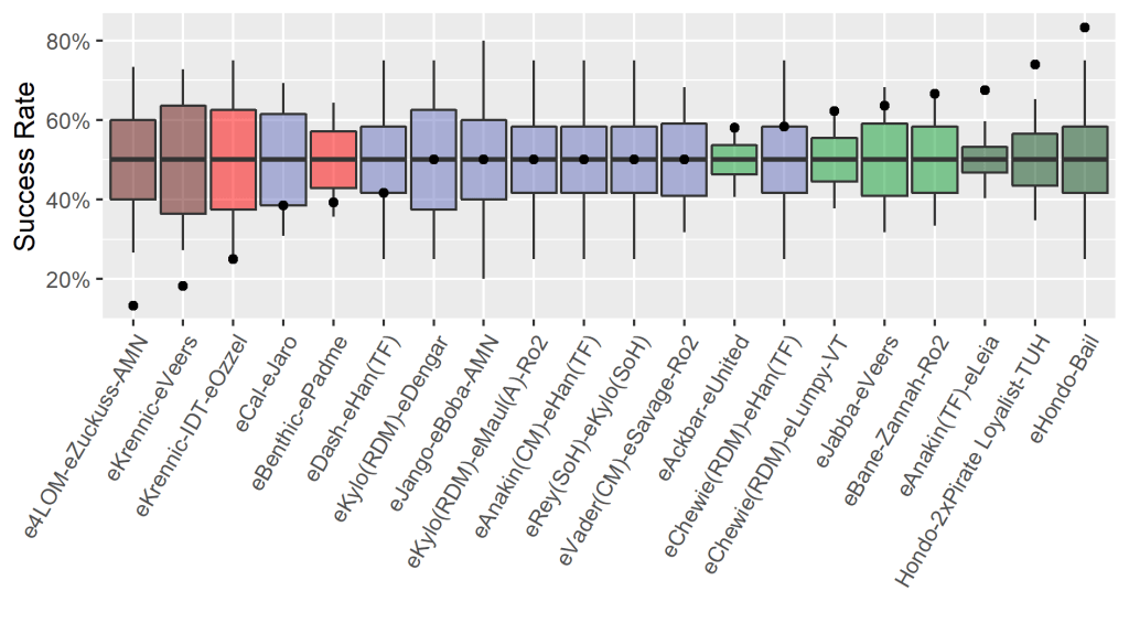 The benefit of this analysis, is that you can see while Ackbar decks only had a success rate of 58%, this is quite a bit higher than you’d expect from chance (p value of 0.11 for you stats nerds), suggesting this is a genuinely strong deck, despite its relatively average looking performance.
