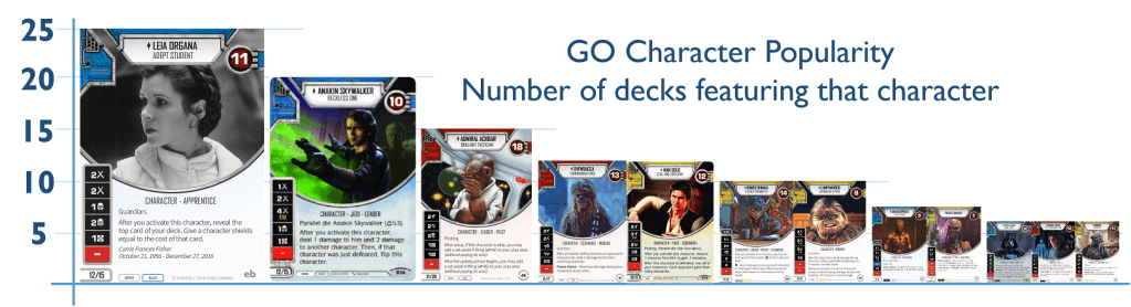 There’s a nice rock-paper-scissors circle of the top decks, represented by mono-blue > Ackbar > pirates/wookiees > mono-blue. However, the incredible success of Hondo Admiral decks in the GO’s is a concern.