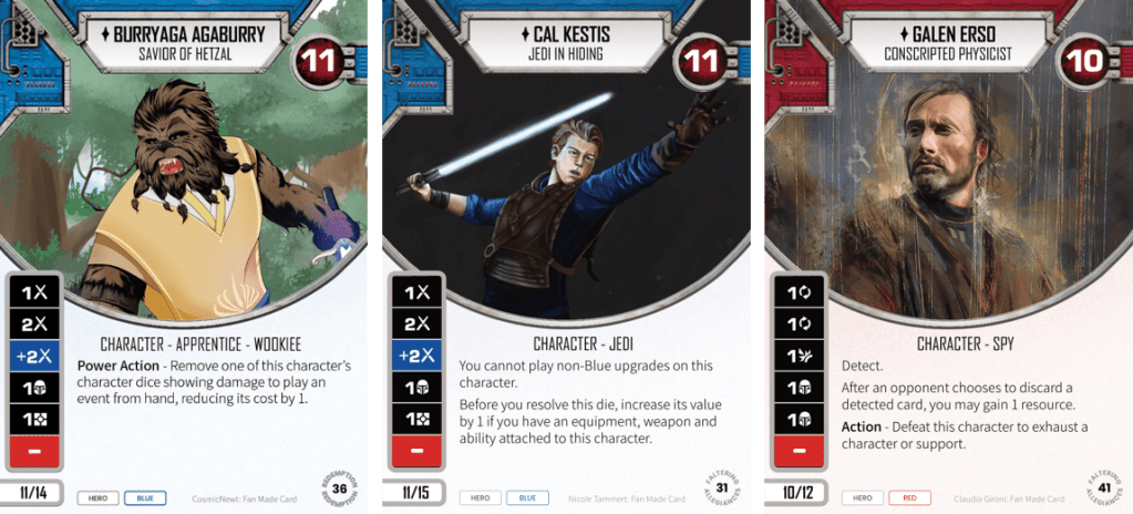 And finally Galen goes down to 9/11. This puts him in a strange place points-wise as a spy, but makes him a really solid support character in a non-spy deck. There’s only 3, hero, 19 point characters, and two of them are spies. The third is Qui-Gon Jinn, and Galen could see a place in a pairing there, in a similar deck to the eQui-Gon/eEcho deck which Royzston won the echobase weekly with, and which we published an article about this week. However, his ability works much better when more cards are detected, suggesting to me this change won’t make any difference, unless someone can get Galen and Bothan Spy with Obi-Wan or Jyn to work.