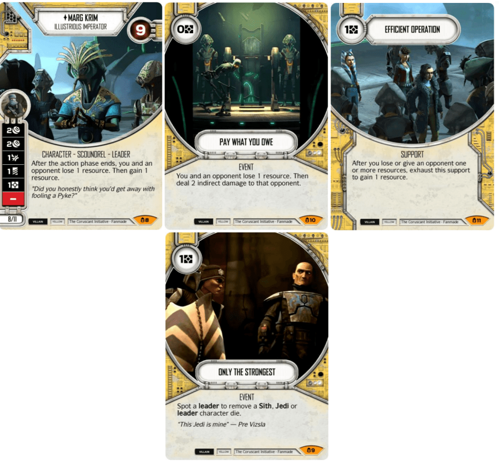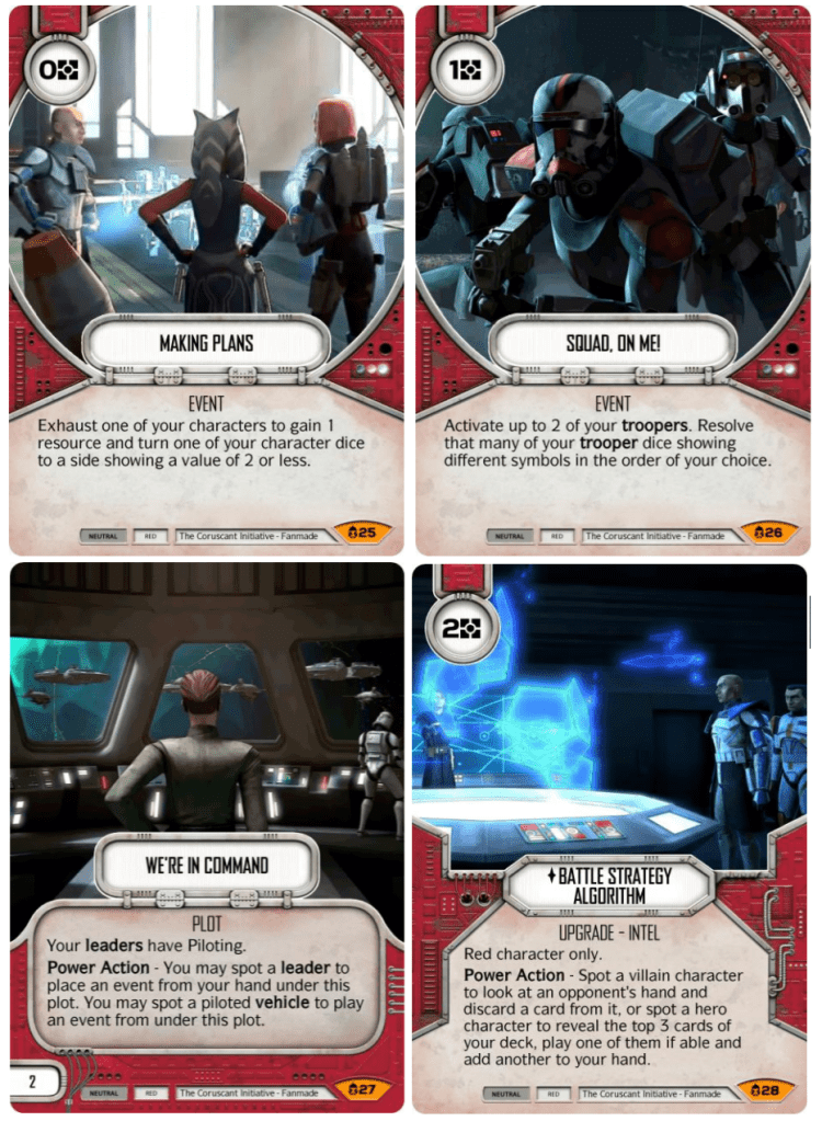 Overall, this looks to be a fun mini-set from The Coruscant Initiative, with a lot of interesting ideas and mechanics packed into a small number of cards. I think I’m most looking forward to trying out the two Command plots (The Last Command and We’re In Command).