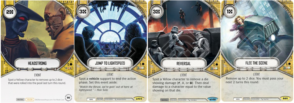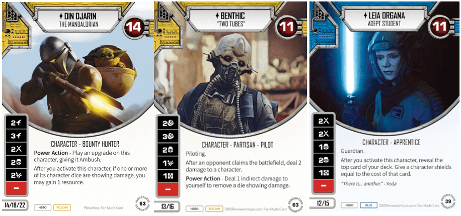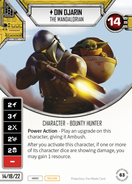 Din Djarin enters the game as the first character to be playable with 3 starting dice at separate point values (does Hondo count here?). This is a concept that was going to be introduced with the unreleased Wild Horizons expansion, and again, happy to see ARH take further inspiration along with the new keyword Renew from Wild Horizons.