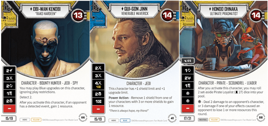 Obi-Wan is probably the closest match to Din; yes, Obi is a point higher than Din, but given that Obi has three subtypes, Detect 2, an activation ability and a passive ability to allow blue abilities, he warrants being 1 additional point over Din. It’s subject, of course, on the value that you, the reader, put on Detect and the allowance of blue abilities onto a yellow character. For me, he’s right where he should be.
