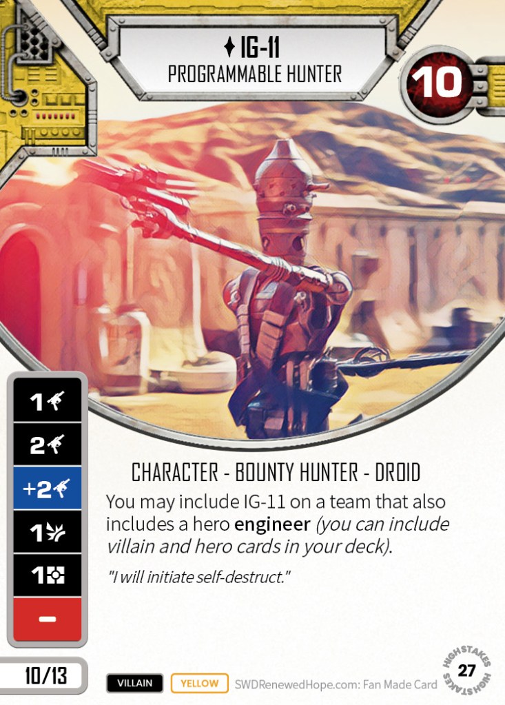Now, on to the big bit. Aside from his basic stats, which are a little underwhelming, IG-11‘s text opens up a previously unheard of world of deck building possibilities. Add him in to a lineup that includes a hero engineer, and you’ve got yourself a deck which can run all the best villain and hero cards in the same deck.