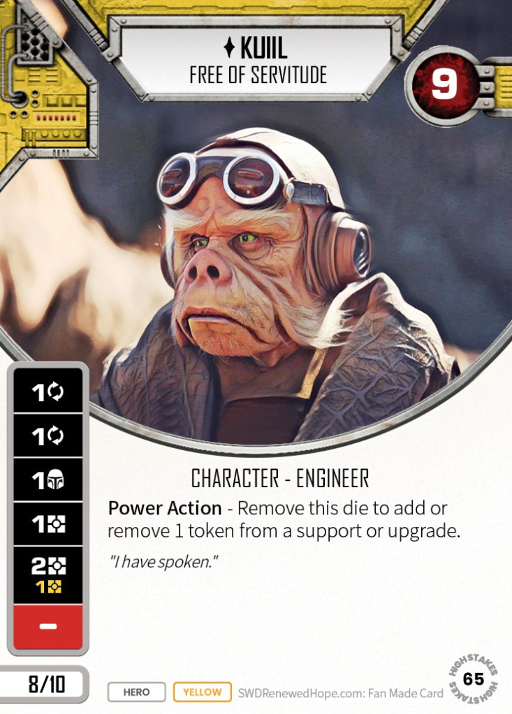 Overall, I’d say this Power Action is a nice boost which will likely provide a small but significant boost to a number of different decks, not least of all since you can get this character elite for 10 points. I’m definitely going to be trying out eKuiil with Luke Skywalker in a Bandolier build, with Whistling Birds and Prescient Leap, and I might even resurrect my 6 dice yellow deck, with eKuiil/eSatine/eWicket/Sound the Horn.