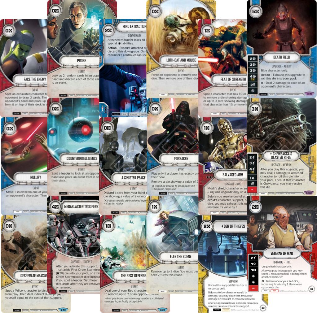 I’ll be honest – I have not got a deck list to share here; but I have thoughts on splashing Red to bring a few spicy villain cards into the hero mix. First thoughts – General Rieekan. 10Pts single die we are bringing a red character with the Leader subtype. This splash of Command will enable Megablaster Troopers (At full value), Probe, The Best Defense, Face the Enemy & Counterintelligence. We could even use the new event Danger Close to bring in an Outrider or Razor Crest from our discard pile.