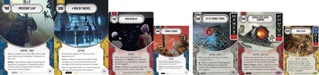 Charging up Prescient Leap could be an effective tactic with this support character, though you’ll probably want to pair him with a lot of blue dice to make this work quickly. Kuiil can pull damage off Den of Thieves, which turns his dice into a once per round “heal 1”. I think he could almost make Firm Resolve playable, as then you can turn any of his dice into a single focus side, especially since Firm Resolve is an Action, not a Power Action. However, I’m still not playing Painful Lesson.