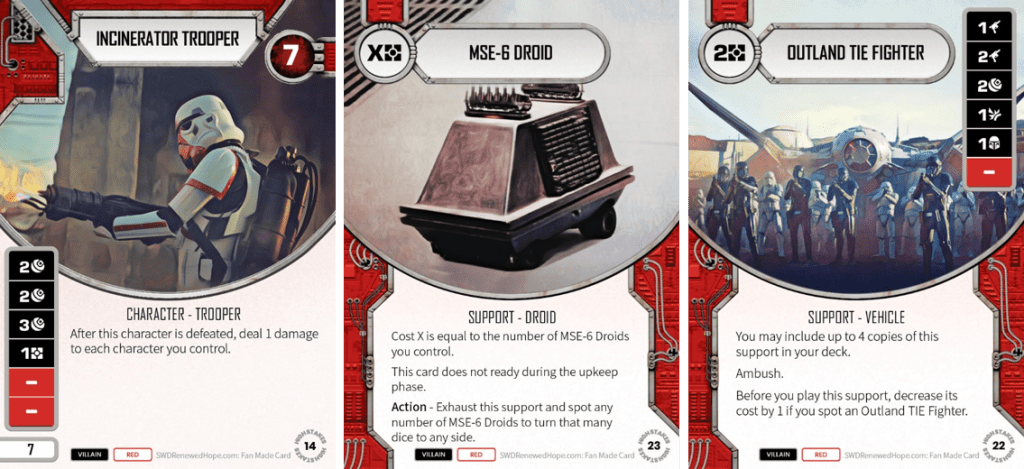 Outland TIE Fighter shares the cost, ambush, deck building bonus, and sides of TIE Fighter, except it trades the +2 ranged for a 2 ranged, which is a huge step up. You lose the tutor ability, but once you have one of these out, all future copies cost you just 1 resource, which is a bargain. Expect this card to be an a common include in a villain support decks.
