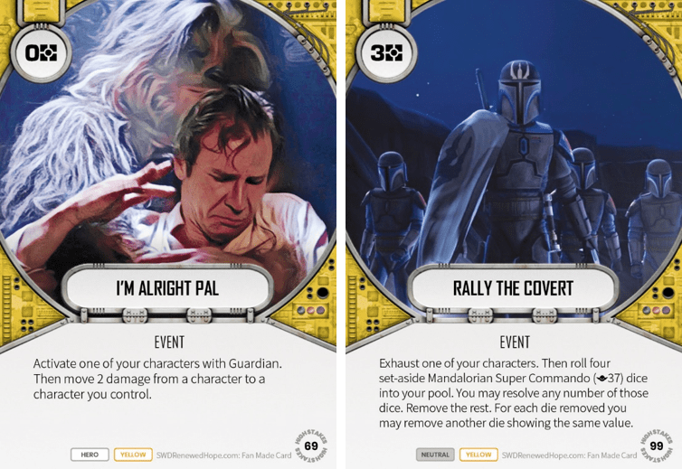 Rally the Covert is a card which has caused some disagreement amongst us here at echobase. I think it’s so-so, but the others think it’s potentially very strong. Yes, you can include this in a deck with a character like Pyke Sentinel or Nightsister Zombie and do a decent amount of potential damage, but in reality, the average damage this does is about 3 for 3 resources. However, if the opponent is sitting on a number of 0, 1 and 2 sides, this could be a strong mitigation play. Note, those Mando dice have no resource sides, so you can’t net a resource back with a decent roll.