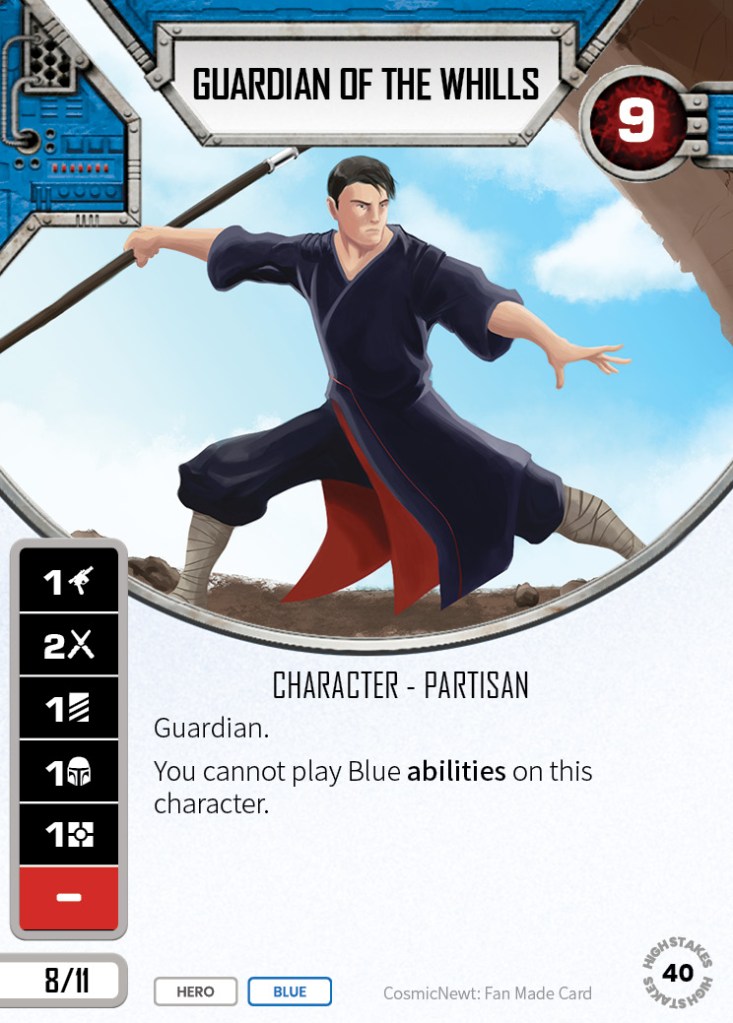 The Guardian of the Whills is a really great support character. A guardian with 9 health for 8 points is good enough, but he also has a 2 damage base side, and you can run him elite. This guy is basically the hero version of Savage. However, since hero have Heroic Protector, and since he has no pay sides or modify sides, I’d say he’s potentially got the edge. Not being able to play blue abilities on him is a fair compromise. The partisan subtype is a curious addition. Tricky to see what it’s achieving in the current card pool, but does I suppose allow for Reckless Ambush plays, as well as Near Miss in a pairing with Benthic. I like this guy non-elite with e²Din Djarin.