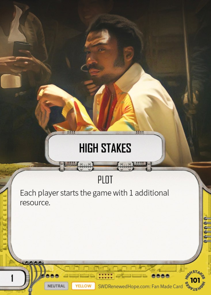 The penultimate spoiler, and the eponymous card of the set, High Stakes is going to be hugely influential. No play requirements for it; you just need to be running yellow and have a point spare, and you can start the game with 3 resources. Being able to plan around starting with 3 resources means that 3-cost upgrades and supports can be included more readily in your deck, as you know you can open with them. Turn 1 Vibrosword anyone?