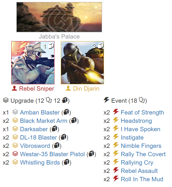 A solid deck, that contains just 6 FFG cards, none of which were the upgrades, plus the Sniper and the battlefield.