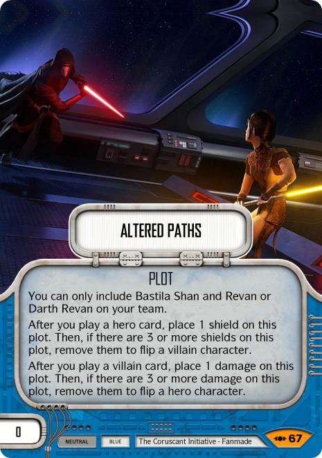 Much like Temporary Truce, this card allows you to run a villain and a hero together, meaning you can include hero and villain cards (and also neutral). However, as is clear from the fact that Revan and Shan have A next to their card number, they’re flip characters. Therefore, you can use this plot to start with either Villain Darth Revan/Hero Bastilla Shan or Hero Revan/Villain Bastilla Shan. You could of course go double villain or double hero, but I don’t know why you would want to, as you would miss out on the chance to include hero and villain cards in your deck.