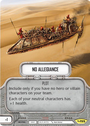 No Allegiance is a bold and interesting choice. In Standard we have Jawa Junk Dealer (5), Nar Shadaa Thief (7), Merrin (11/14), Aphra (10/13), Hondo (17/21) and Greef (9/12). I would say that of the available options, Hondo/eMerrin looks the most appealing, for a 15 health Hondo and a 10 health Merrin (and a Zombie), plus villain curses in my deck. The relevance of this card is going to depend entirely on how many neutral characters come down the line from ARH.