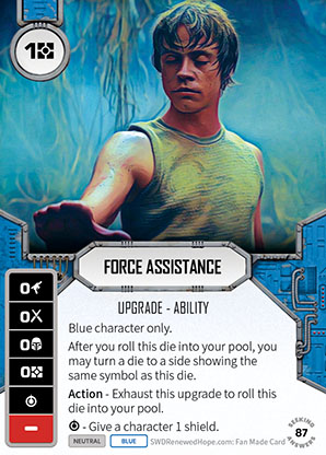 Next up is Force Assistance. A truly fabulous card. It may slow you down but I see this as a card that kind of gives you two focus a turn. You do have to have all the same sides of this dice available on your other dice or your opponents but that’s not too much of a stretch. A subtle offensive and defensive card at the same time. What’s even cheekier is that as well as all doing this you still might get a cheeky shield out of it and it can help be a base side so you don’t end up with stranded modifiers. Great for pairing up those Zeb sides when he’s stomping around with a blue friend.