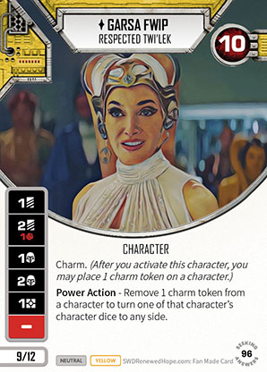 I expect this was an easy character to decide to give the new Charm mechanic as it is so fitting, but with Garsa it feels like you are getting a three dice character with the third dice always being a one focus side. That alone for a 12pt character feels amazing but her dice sides, health, colour, the whole package basically allows her to fit in to many pairings. I’ve seen her be played in Mill decks, Big/Little damage decks and three wide decks. She’s such a good character she can fit anywhere especially being Neutral. I’m pretty sure that if you ask any player what their favourite Garsa deck is you’d get back a lot of different answers. Mine is Leia Organa from Redemption with Garsa and Path to Mastery which all came about from wanting to give Qui-Gon’s Teachings a try which let’s you turn taking shields into damage.