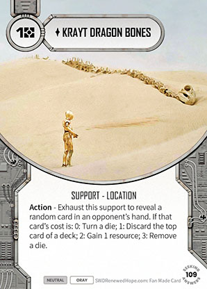 Krayt Dragon Bones is such a fun card. It’s possible to get a look at your opponent’s hand in some decks to know what you might be getting when you use the Action but you can always find a good spot to use this hoping to get one of the effects. Better in mill decks as hitting a one is much more useful then as it forwards on your game plan. It’s grey neutral so this can go in any deck and always proves useful. I find myself dropping it into many decks I build. It might not make the final thirty but it’s never far off.