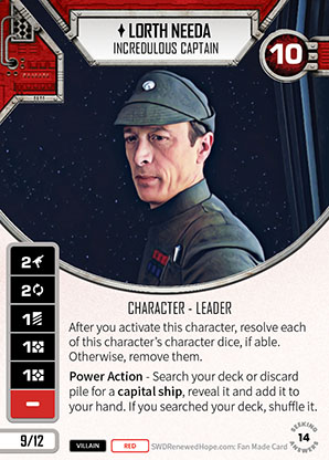 I said final choice so you might be wondering why Lorth Needa has just made an appearance. He’s here as I had a little fling of really liking this card but I’ve now swung to hate and we all know where that leads. He action cheats, he has two resource sides and all sides are useful. He gets you a huge support. Sounds awesome right and I keep coming up with deck ideas to use him in so what’s not to love. He gets you a big ship but you can’t guarantee to use his resource sides in order to play the ship as you get what you are given and that’s that. Can’t manipulate them, nothing. You think you can set up plays with him. Roll in other stuff first to use his focus but what happens is that your opponent knows he is free to remove those other dice as they know that his dice can’t be removed so why not. Not being able to manipulate his dice tend to mean that you don’t have what you need when you need it. Start of the game I want those resources but Needa says NO, discard and a 2 focus. Late game you probably want the focus or the damage but NO, Discard and a resource. He’s so frustrating. I’ve not even mentioned those blanks you roll are dead dice unless you can roll a focus on his other dice at the same time and you only have yourself to blame for playing Needa when he rolls a double blanks.