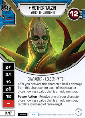 For me Mother Talzin is hands down the best 17pt character designed. It has a possible chance of some healing on activation. She has a very useful, sometimes powerful, Power Action making this character seem like a three dice character, even though the third die might not be one of her own but her partners, or even a set aside Tusken Raider dice from the Tusken Camp. The two shield side offers her some protection. She gets the very relevant sub-types of Leader and Witch so there are a lot of ways you can go with her. Then at 17pts she has a smorgasbord of pairings. It’s a perfect character.